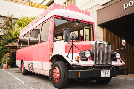道後温泉駅前カラクリ時計~当館を約10分おきに運行しています。ぜひご利用ください。(所要時間:片道約3分)