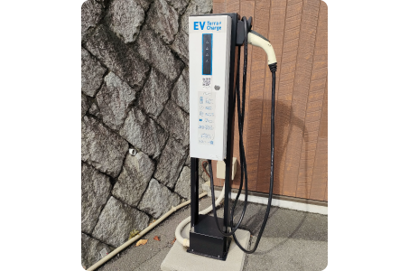 ホテルの⽞関前にはEV普通充電器を設置しております。