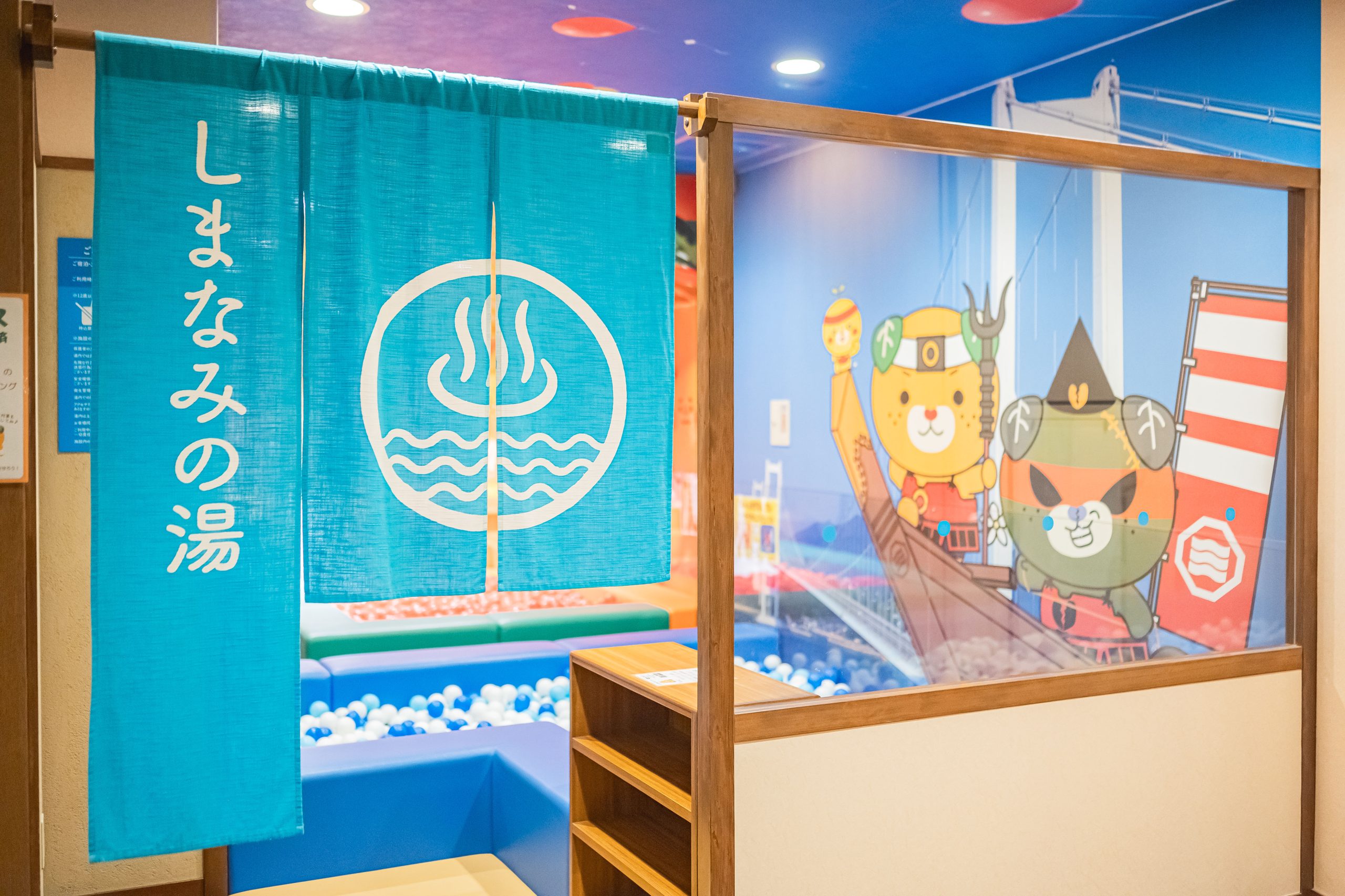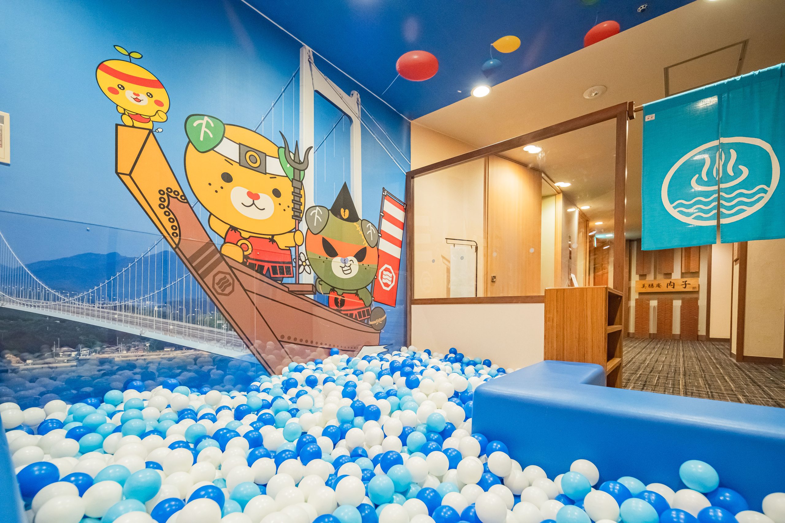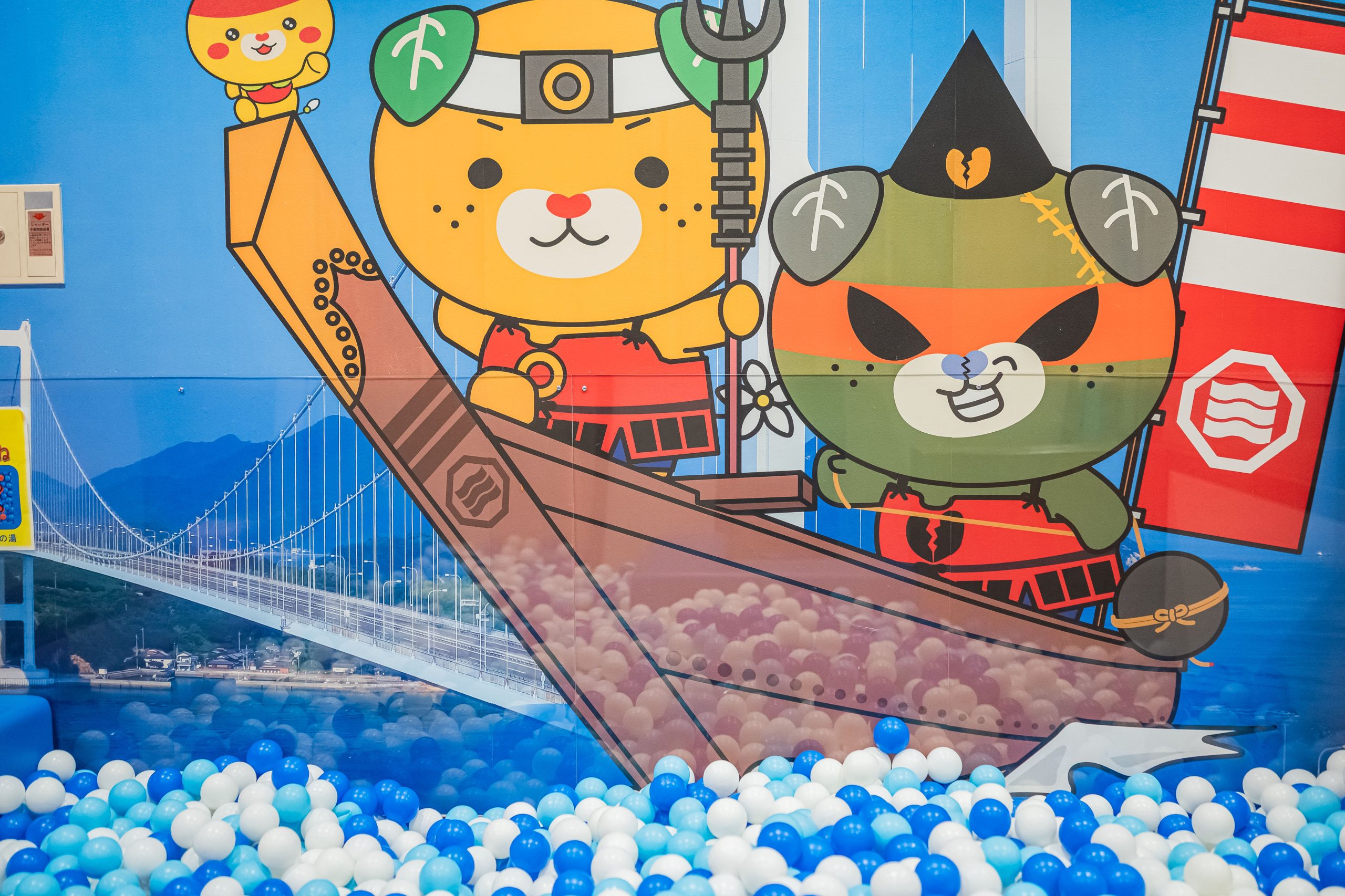 青い海をイメージしたボールプールは、しまなみ海道を旅する気分に。「みきゃん」や「ダークみきゃん」たちが、村上水軍に扮したユニークなイラストでお出迎えします。爽やかなブルーの世界に飛び込めば、冒険気分が味わえる特別な体験に!