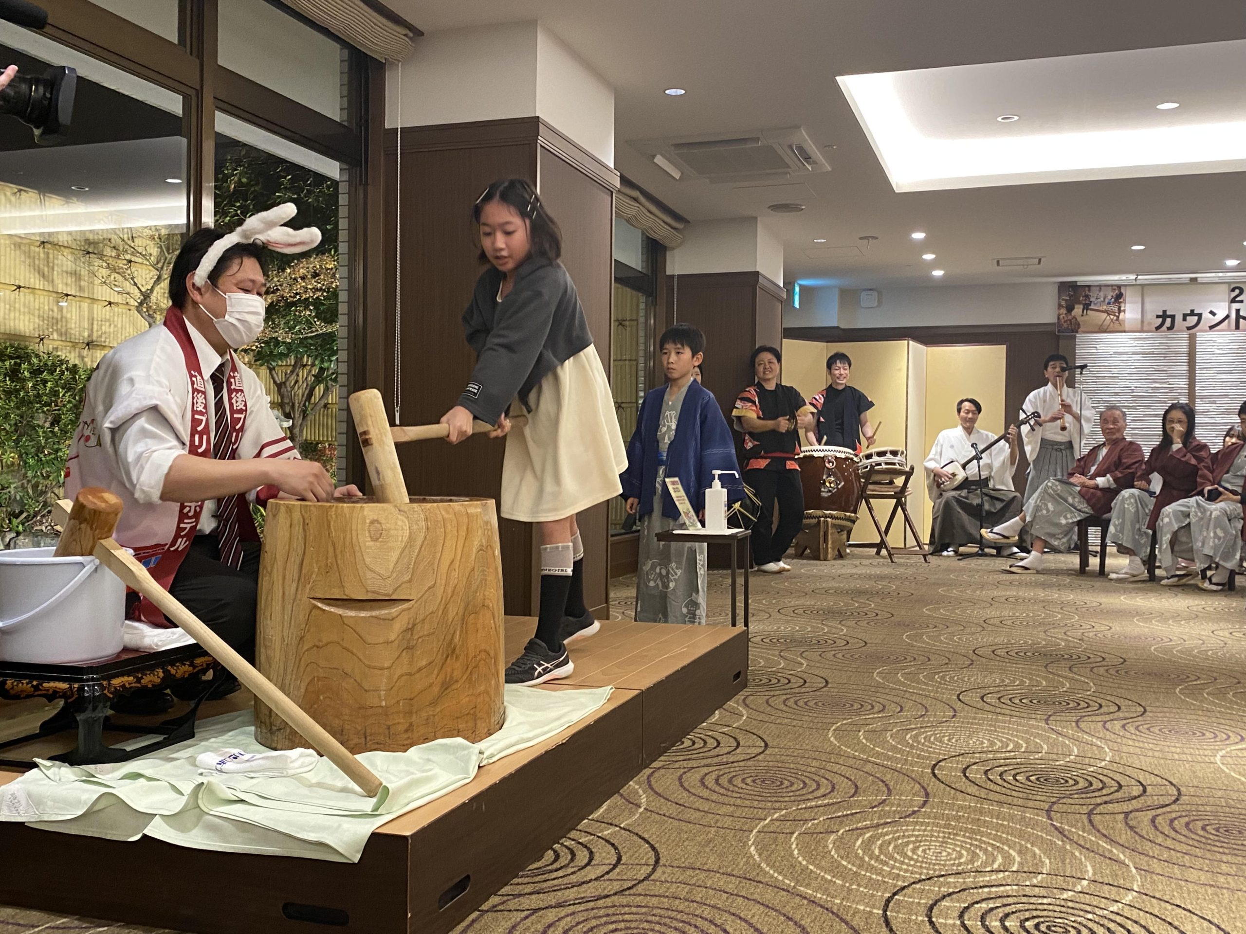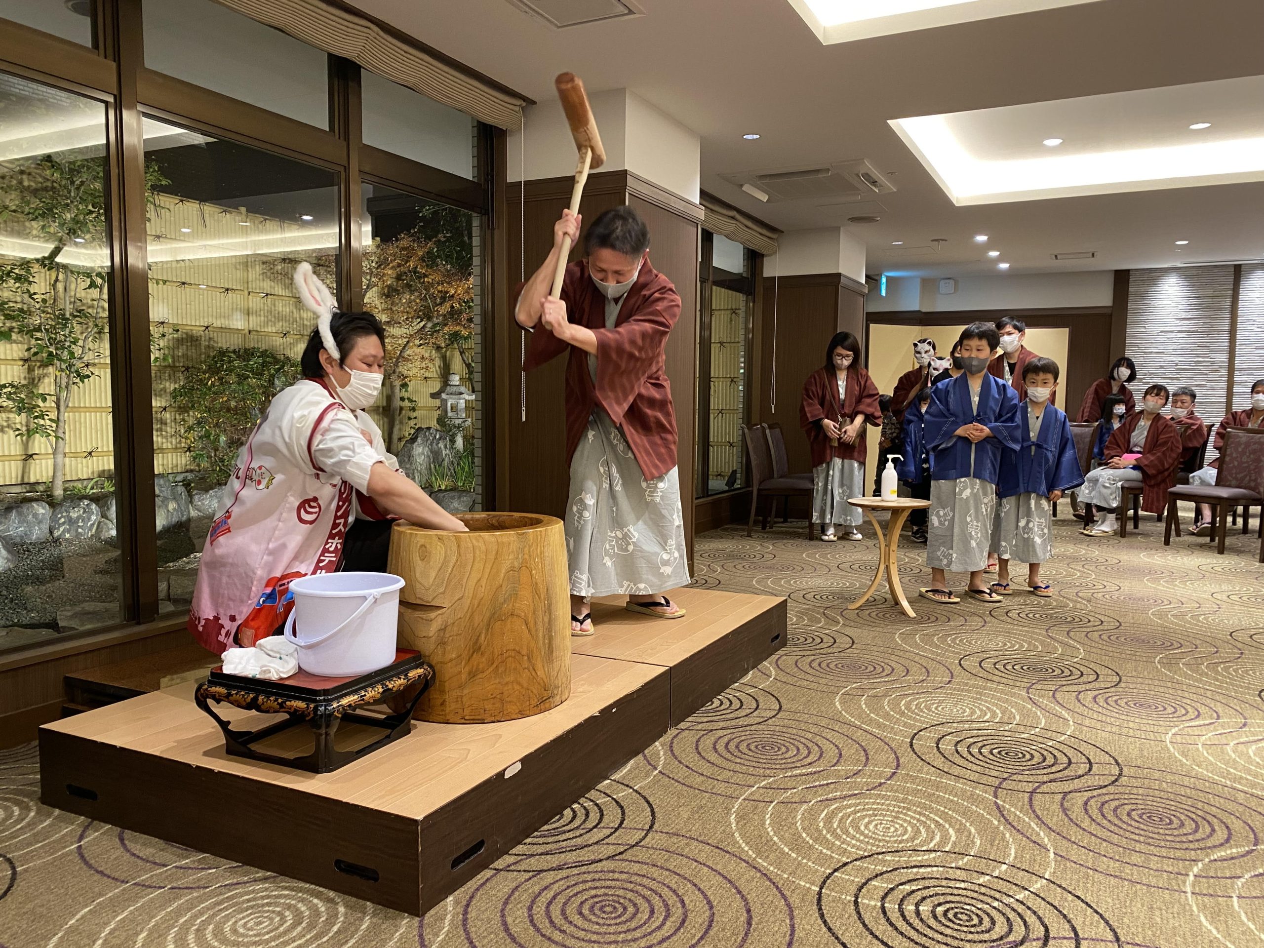 臼と杵を使って、自分の手でおもちをつく体験ができる「温泉もちつき大会」。 大人も子どもも力を合わせてペッタン、ペッタンとお餅をつくたびに、笑顔が広がります。 イベントの最後には、つきたてのおもちを味わえる贅沢なひととき。