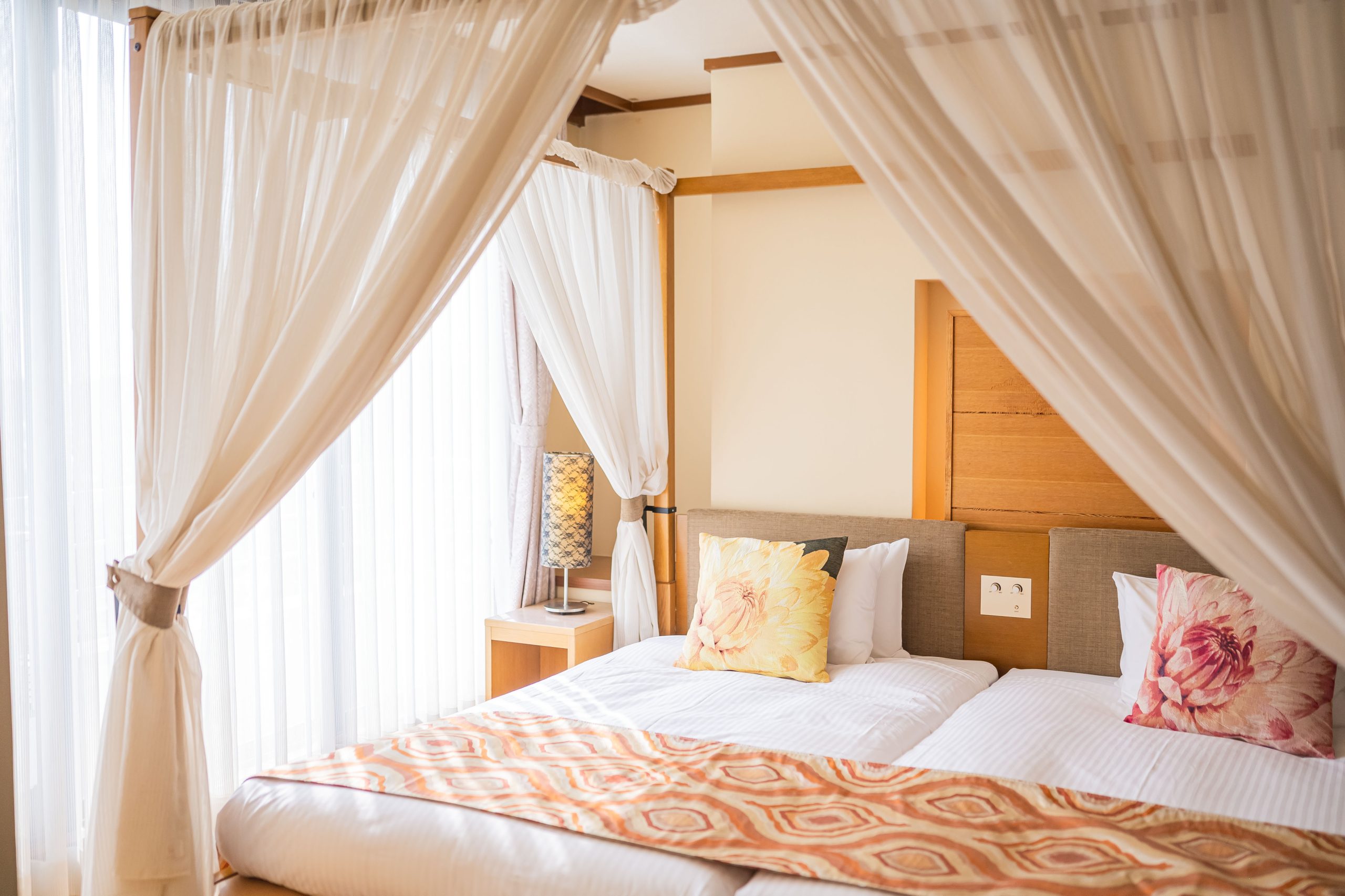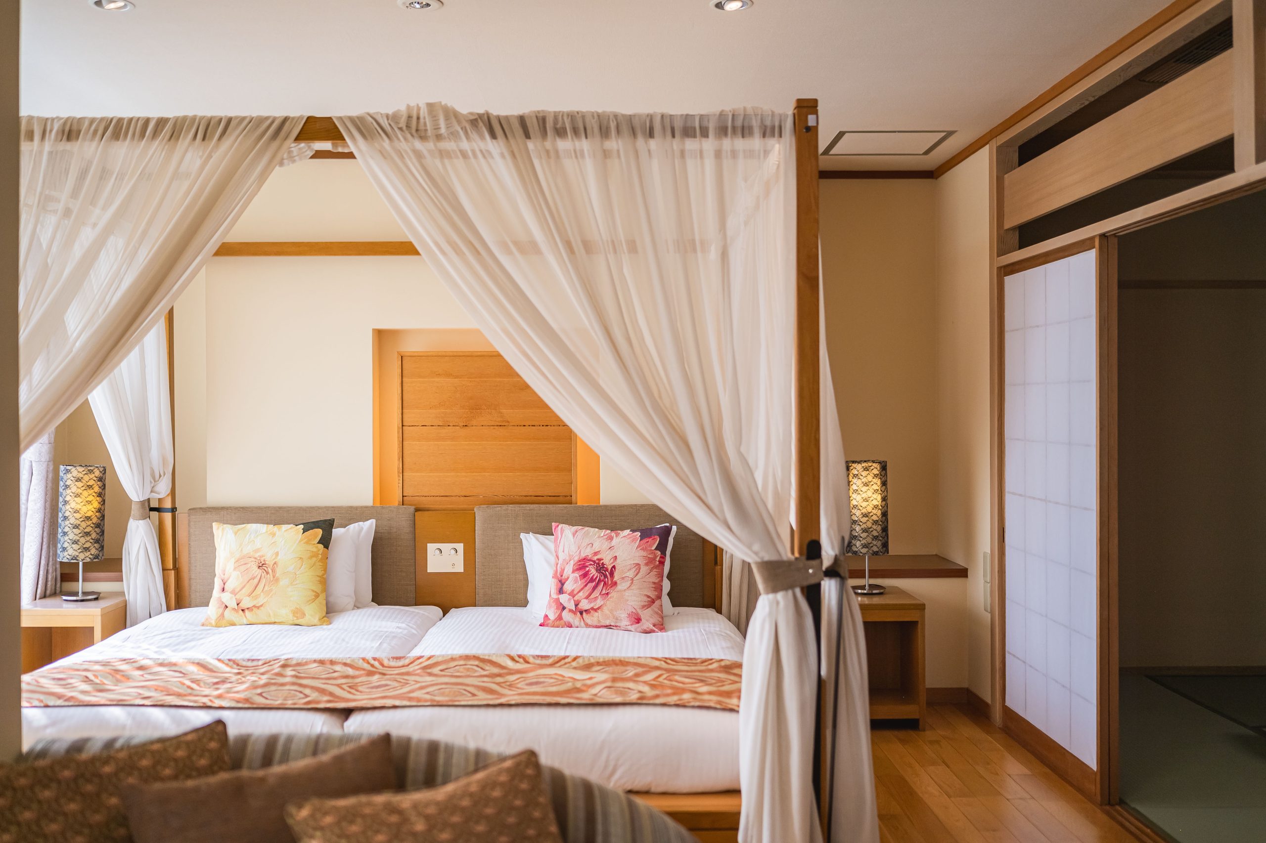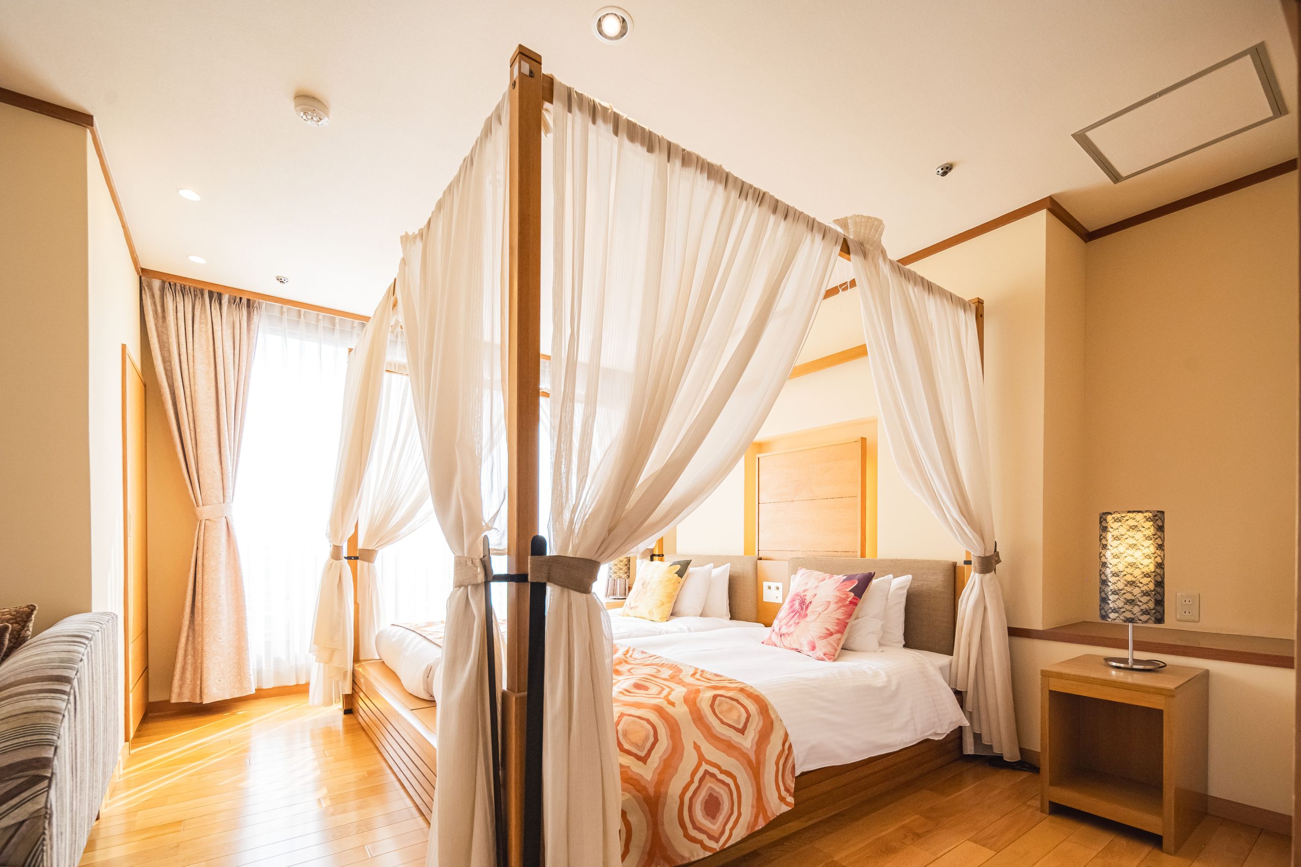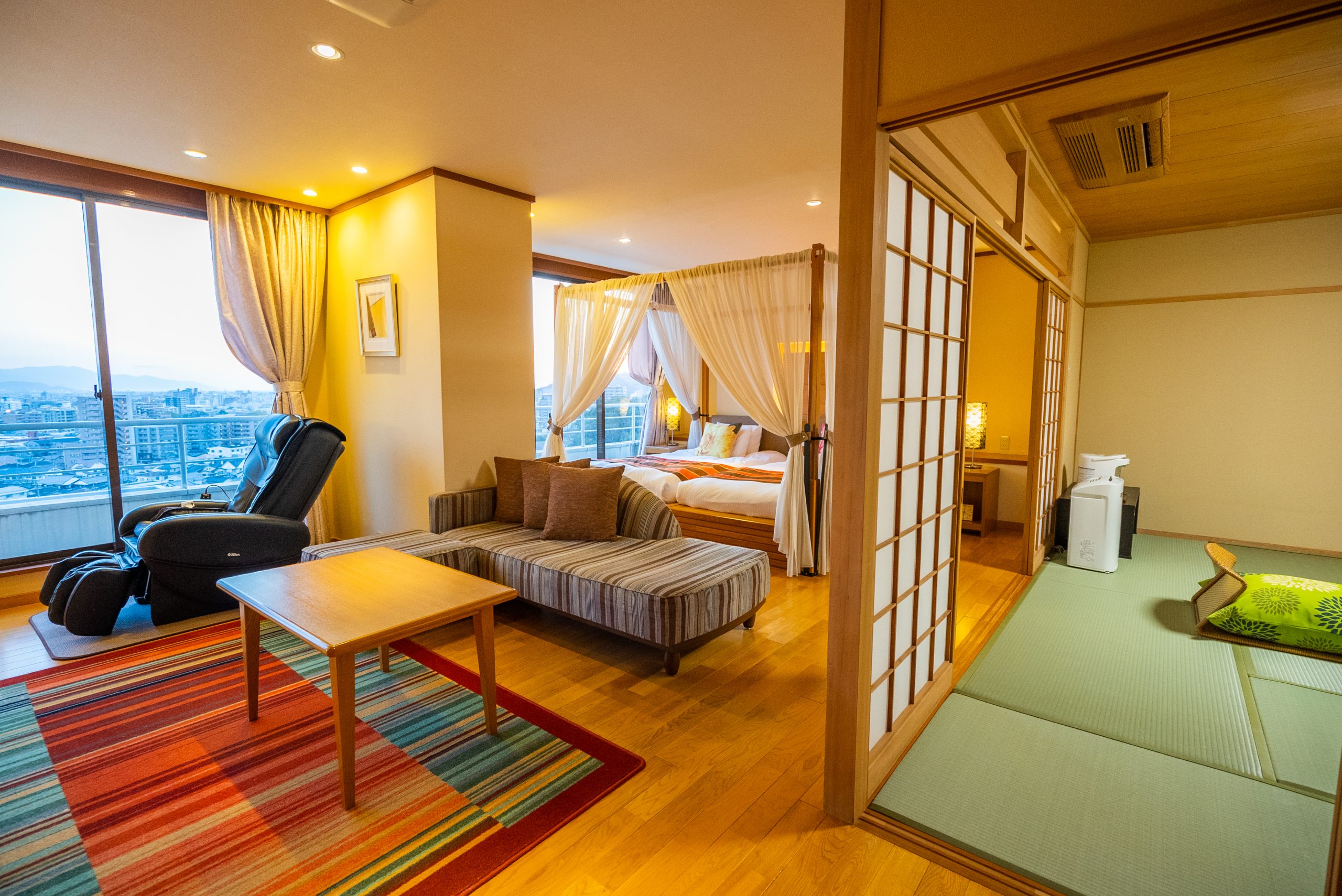 11階・12階に位置する特別フロアの和洋室。優しい光が差し込む明るい客室に、天蓋付きのツインベッドを設えた特別なお部屋。窓からは松山市内を一望でき、大切な人と過ごす時間をより一層ロマンチックに演出します。記念日や特別なご旅行にふさわしい、上質なひとときをお楽しみください。
