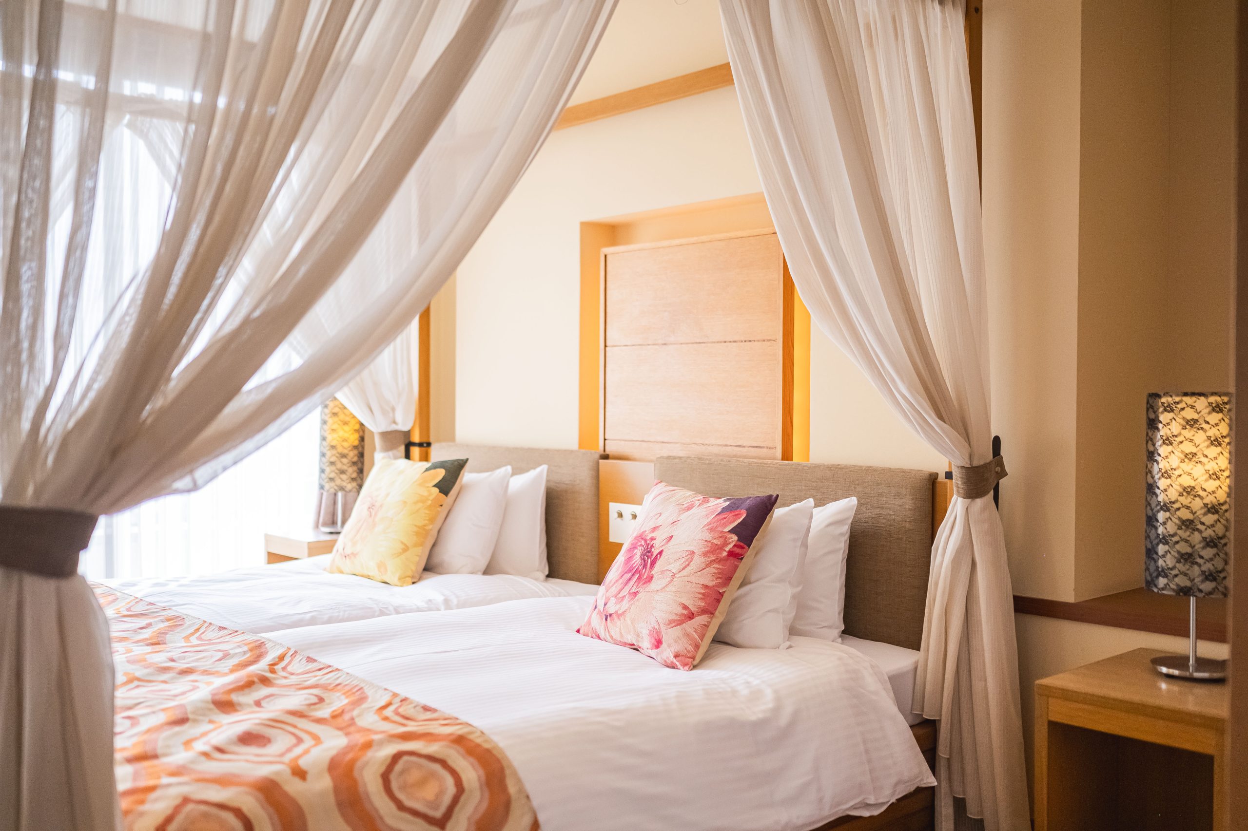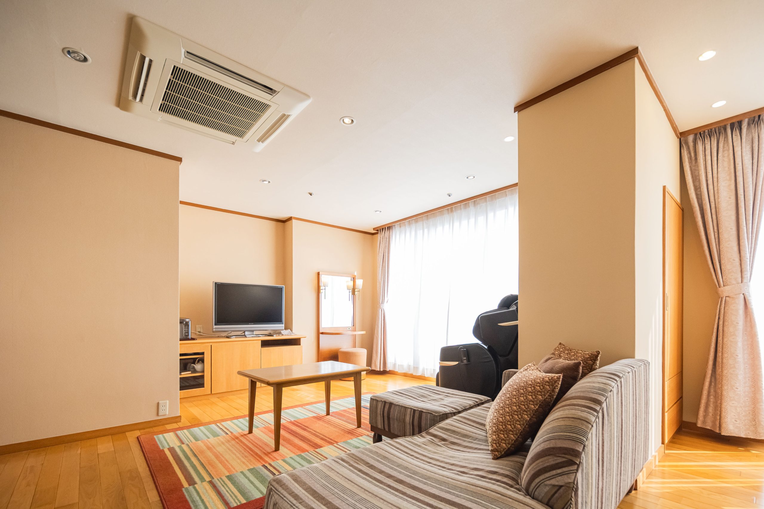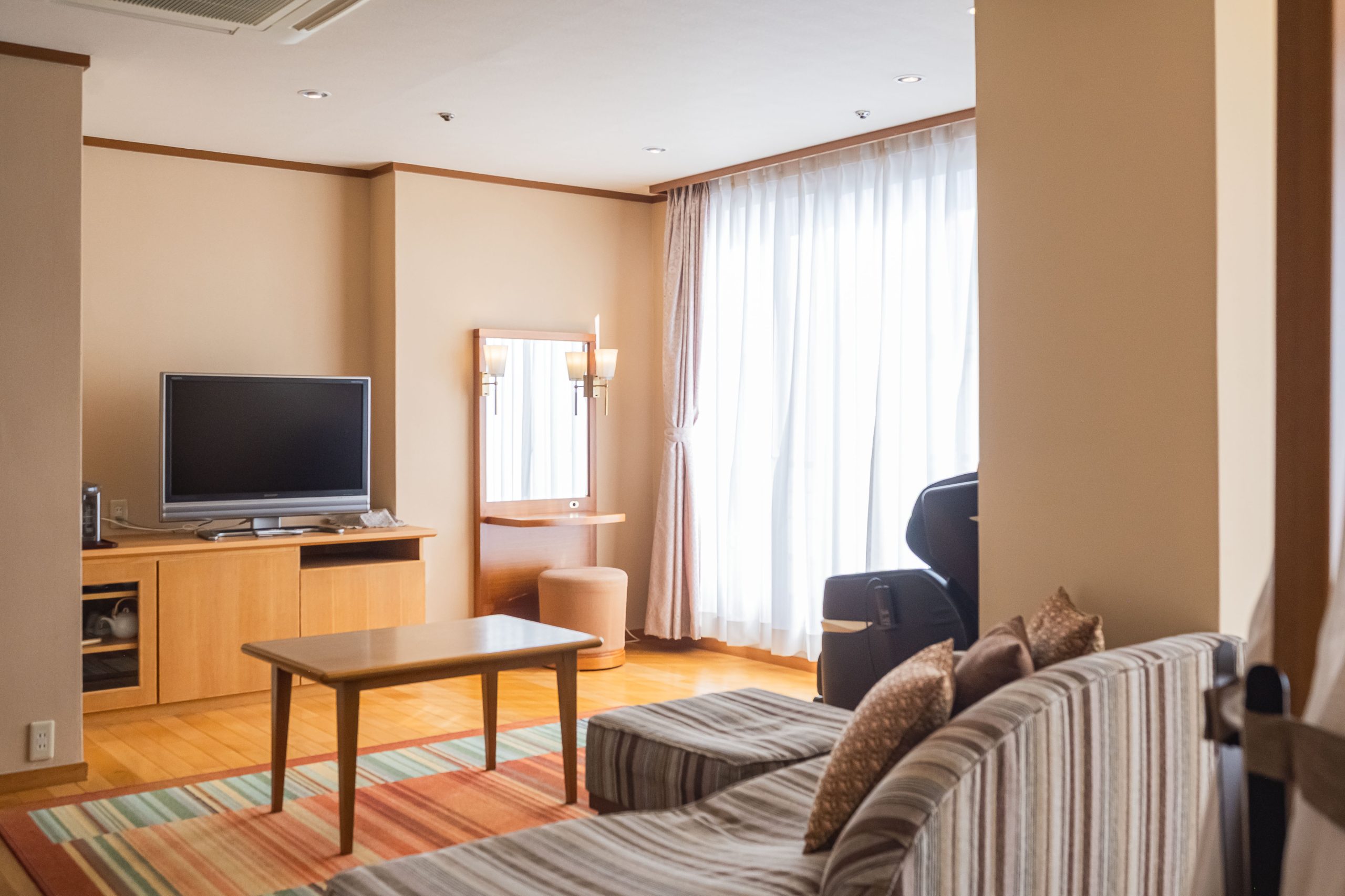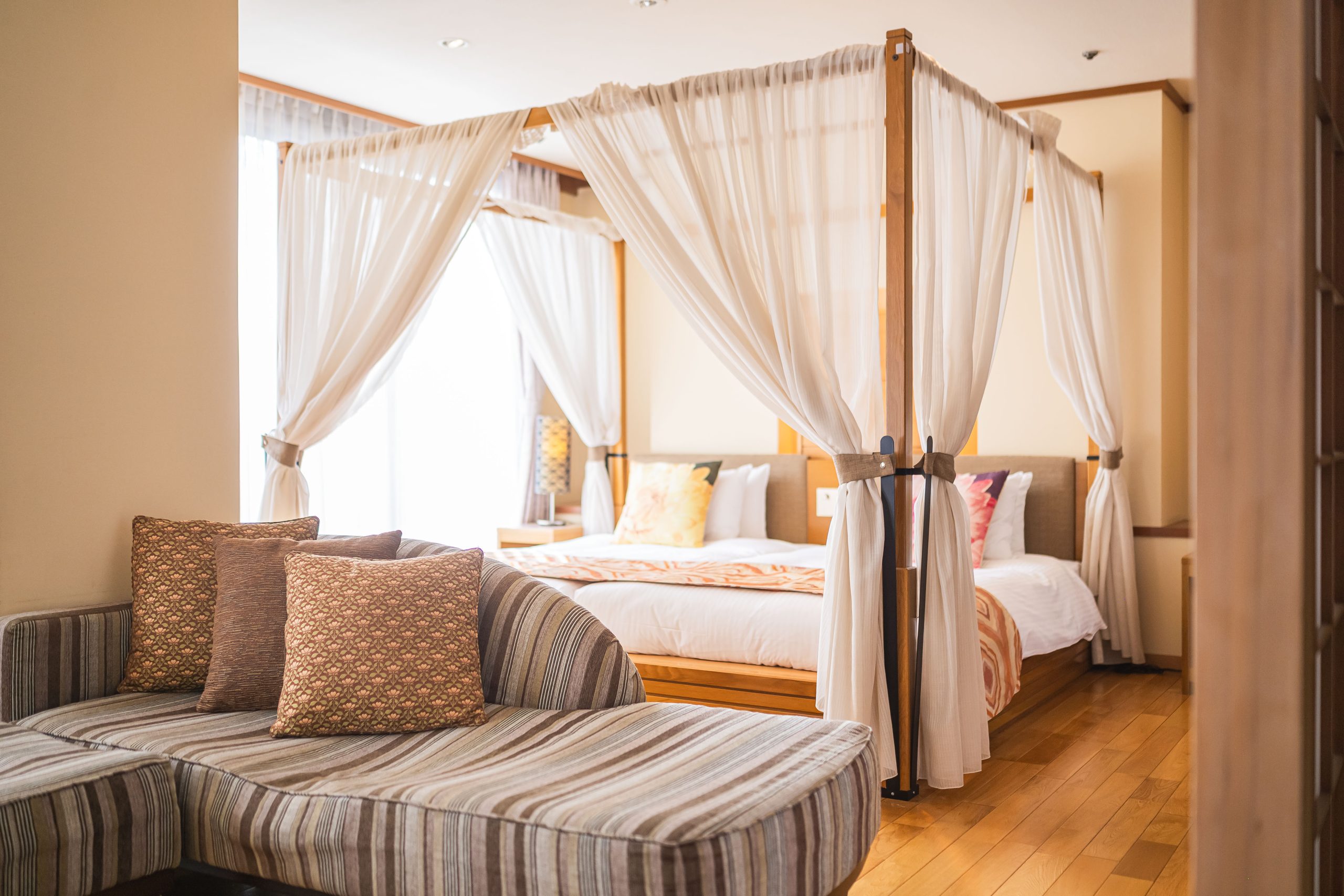 11階・12階に位置する特別フロアの和洋室。優しい光が差し込む明るい客室に、天蓋付きのツインベッドを設えた特別なお部屋。窓からは松山市内を一望でき、大切な人と過ごす時間をより一層ロマンチックに演出します。記念日や特別なご旅行にふさわしい、上質なひとときをお楽しみください。