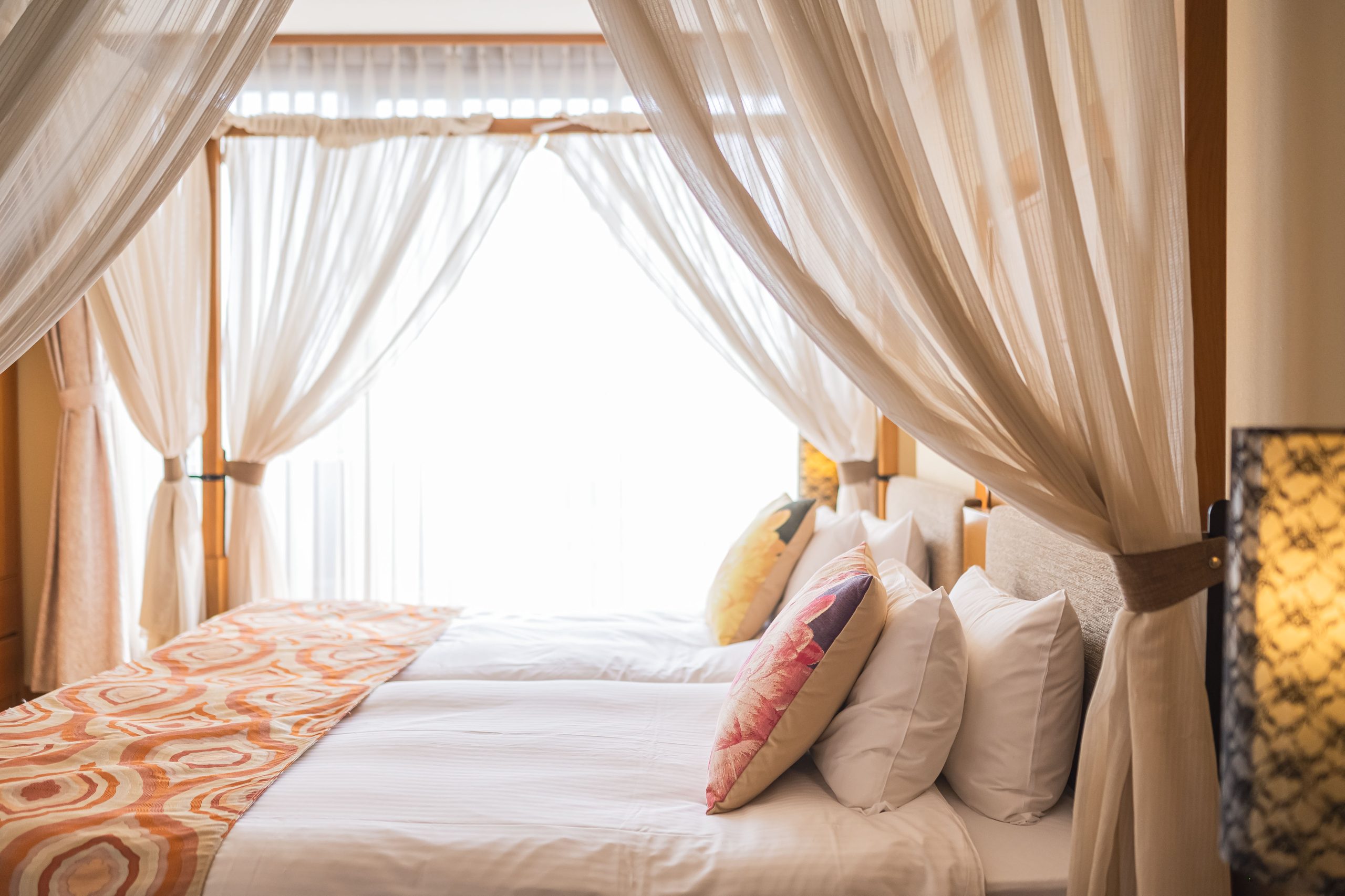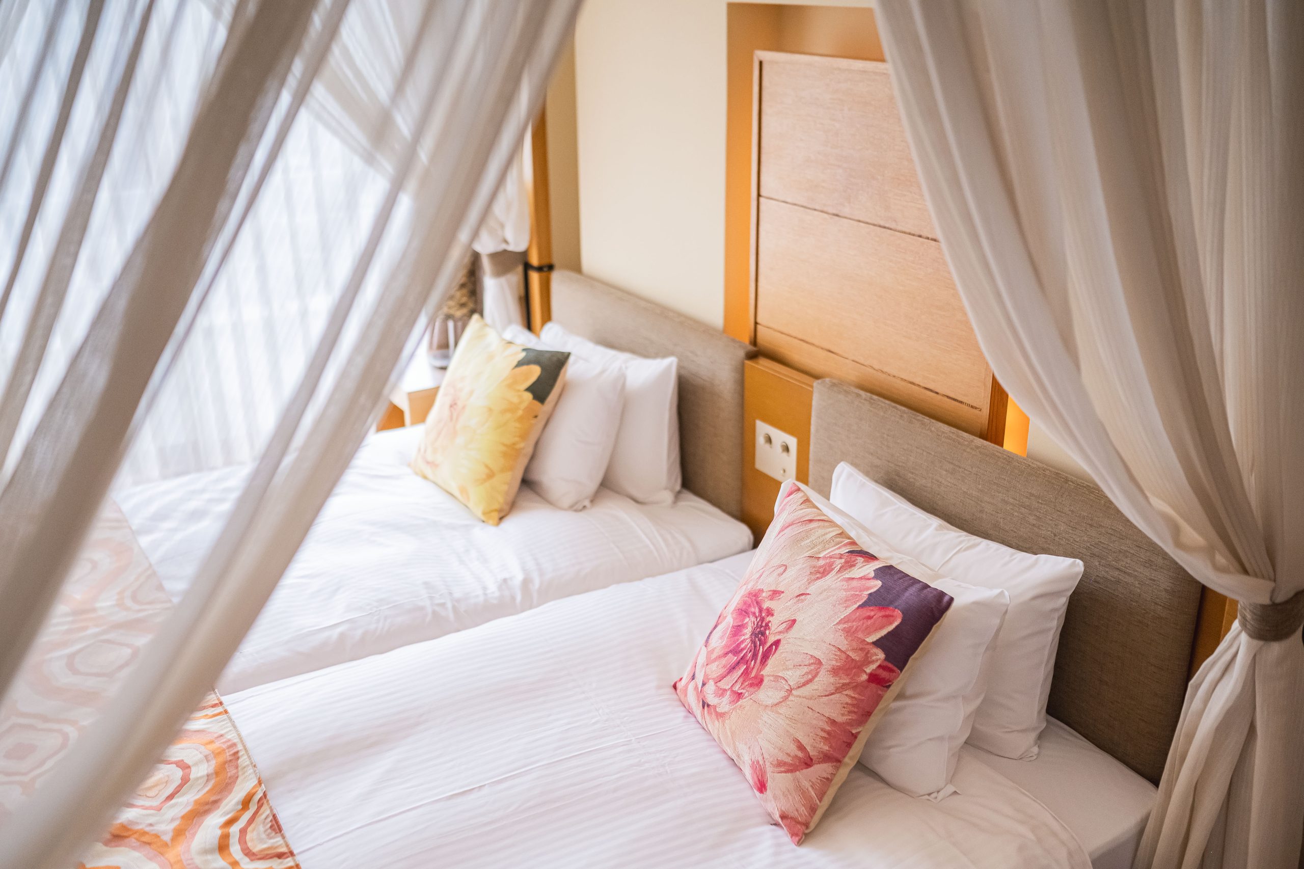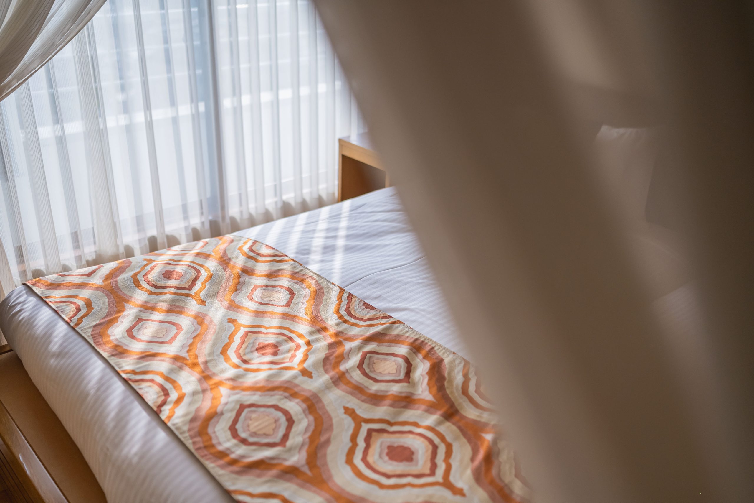 天蓋付きのツインベッドがかわいらしいお部屋。松山市内を見渡せる景色を眺めながら、女子会気分でゆったりおしゃべりも楽しめます。友人同士の旅行をちょっと特別にしたい方にぴったりのお部屋です。