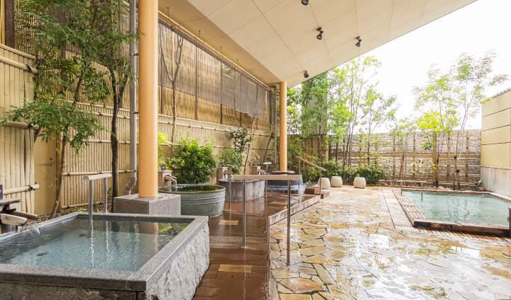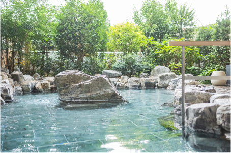 岩を組んだ自然美あふれる露天風呂。開放感いっぱいの湯船に浸かり、庭園を眺めながら、非日常の癒し時間を満喫できます。