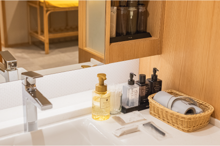 化粧水・乳液・シェービングフォームなど、男女問わず充実のアメニティを完備。身支度に必要なアイテムが揃っているので、快適にご利用いただけます。